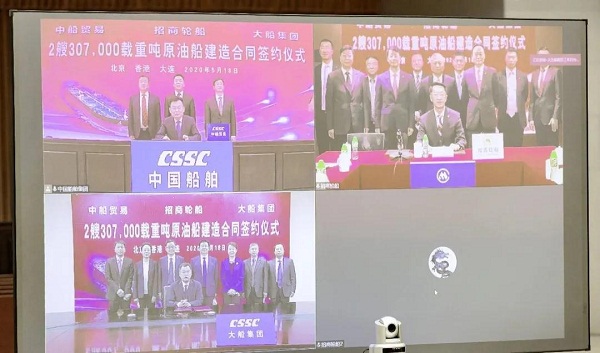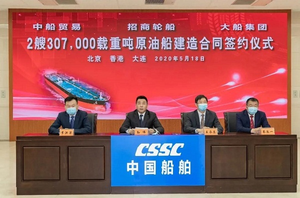 ????5月18日,中國(guó)船舶集團(tuán)旗下中國(guó)重工子公司大船集團(tuán)、中船貿(mào)易與招商局集團(tuán)旗下招商輪船在北京、香港、大連三地以“云簽約”方式簽署2艘30.7萬(wàn)載重噸原油船建造合同。該項(xiàng)目的成功簽約將進(jìn)一步擴(kuò)大招商輪船的船隊(duì)規(guī)模,并提升大船集團(tuán)在全球VLCC市場(chǎng)的占有率和知名度。中國(guó)船舶集團(tuán)副總經(jīng)理孫偉,招商局集團(tuán)副總經(jīng)理王宏,招商輪船董事長(zhǎng)謝春林,中船貿(mào)易董事長(zhǎng)李洪濤,以及大船集團(tuán)領(lǐng)導(dǎo)楊志忠、鄧昌連、張玉環(huán)等出席簽約儀式。
